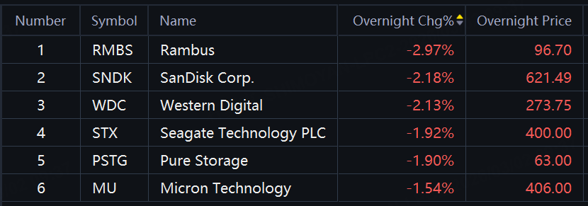 Storage shares slid in overnight trading. SanDisk, Western Digital, Seagate Tech down around 2%.