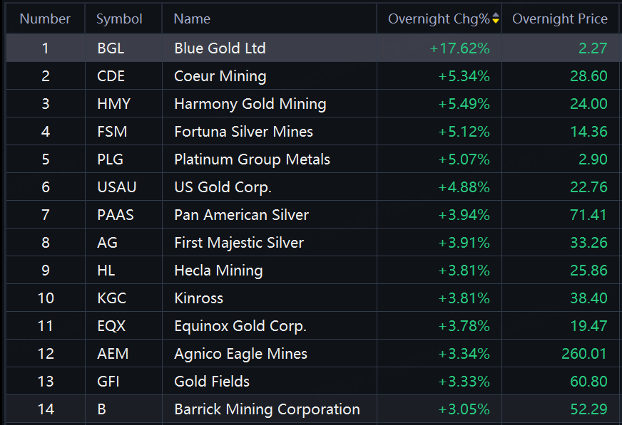 Precious metal shares and ETFs jumped in overnight trading. Blue Gold up over 17%; Coeur Mining, Harmony Gold, Platinum Group up over 5%.