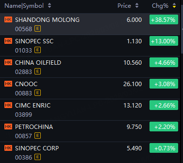 Shandong Molong up 39%; Sinopec SSC up 13%; China Oilfield up 5%; CNOOC, CIMC Enric up 3%; PetroChina up 2%.