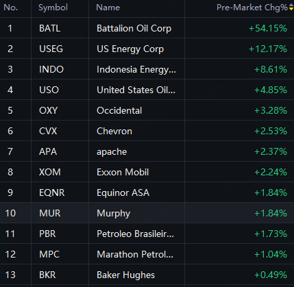 Oil Stocks Jump. Battalion Oil Up 54%; US Energy Up 12%; Indonesia Energy Up 9%; USO Up 5%; Occidental Up 3%; Chevron, Apache And Exxon Mobil Up 2%