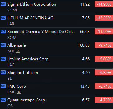 Lithium Shares Tumbled. Sigma Lithium Down 15%; Lithium Agentina and SQM Down 12%; Albemarle and LAC Down 9%; .SLI and FMC Down 7%; QS down 5%.