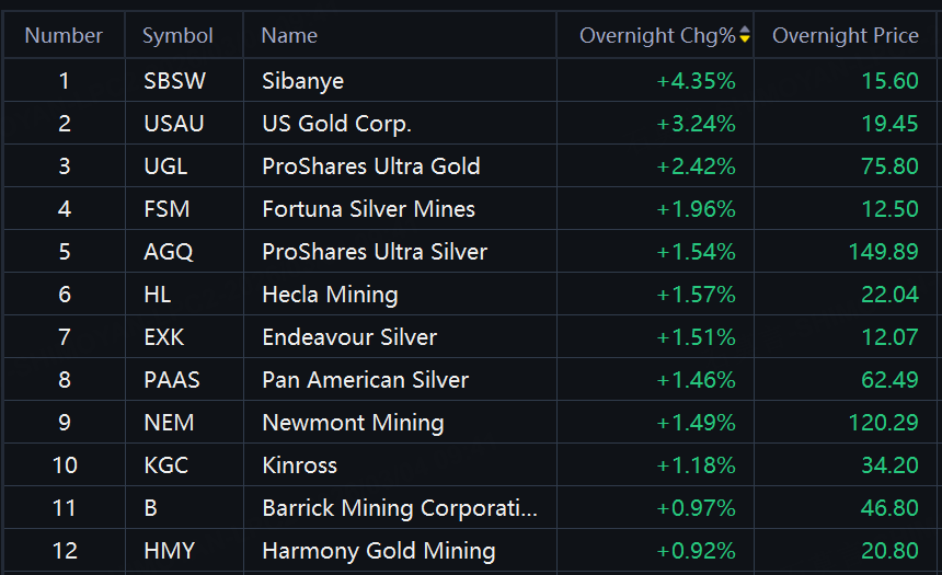 Precious metal shares and ETFs jumped in overnight trading. Sibanye up over 4%; US Gold up over 3%; ProShares Ultra Gold, Fortuna Silver Mines up around 2%.
