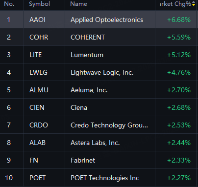 Photonics Stocks Rebounded. AAOI Up 7%; Coherent, Lumentum And Lightwave Up 5%; Aeluma, Ciena, Credo, Astera Labs, Fabrinet And POET Up 2%