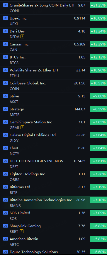 Crypto Shares Shined. CONL Up 21%; Upexi Up 16%; DeFi Up 13%; Canaan and BTCS Up 12%; ETHU and Coinbase Up 10%; Strategy Up 9%.
