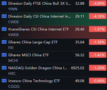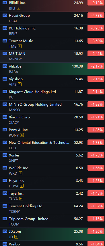 Chinese ETFs And ADRs Tumbled. Bilibili Down 9%; YINN, Hesai, Ke Holdings And CWEB Down 4%; Alibaba, KWEB And Kingsoft Cloud Fell 2%