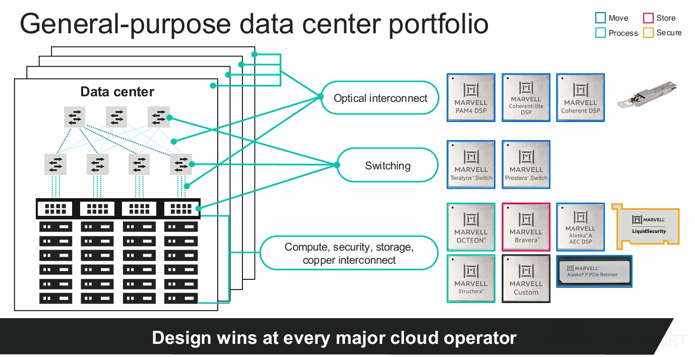 Since 2018, Marvell has acquired Cavium, Innovium, and others, strengthening ASIC and Data Center capabilities. With rising demand from AMZN and GOOGL for custom ASIC and optics/interconnect, Data Center is on an uptrend and the biggest driver of results.