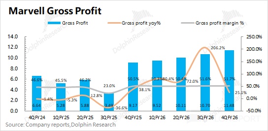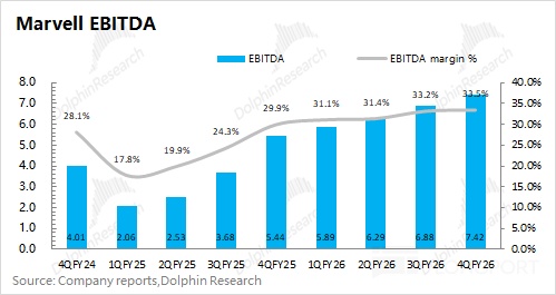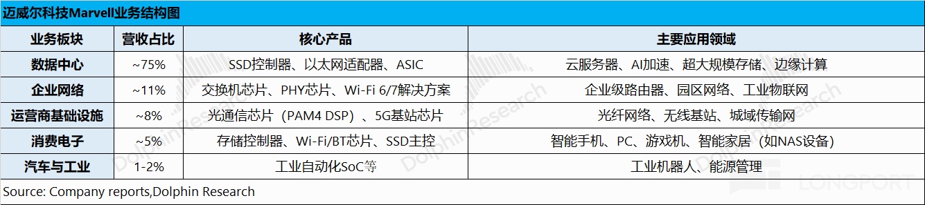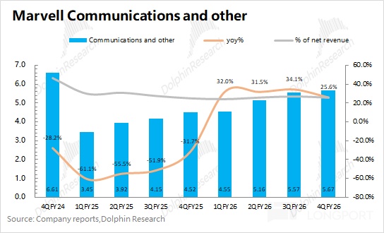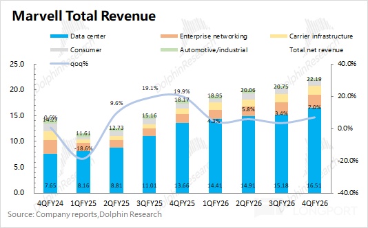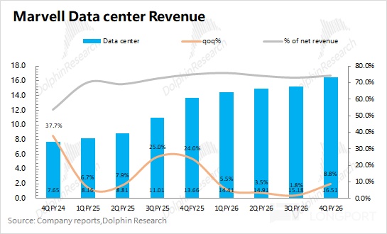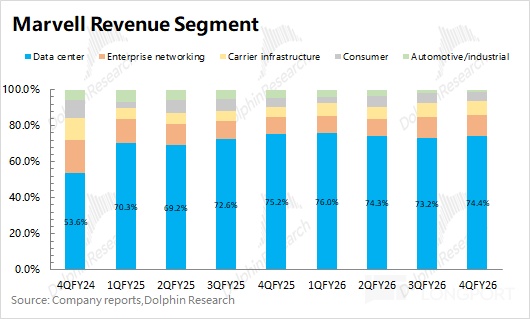 3. Data Center: key focus. Segment revenue was $1.65bn, +8.8% QoQ, led by custom ASIC and optics/interconnect, lifting Data Center to 74.4% of total. Dolphin Research estimates $Marvell Tech(MRVL.US) AI revenue at ~$960mn, +$110mn QoQ.