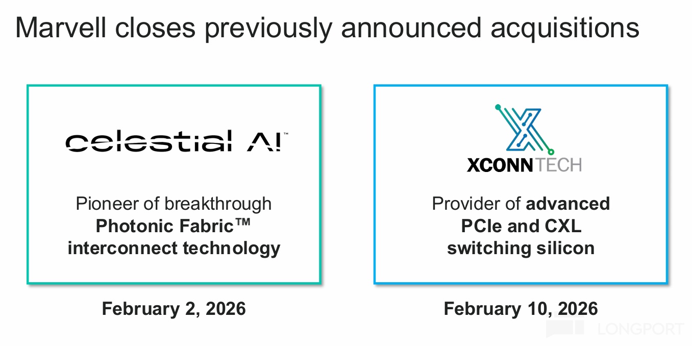 ② XConn: strengthens PCIe/CXL switching to expand AI infra interfaces. It had 20+ customers pre-deal, and should scale quickly via Marvell’s global sales network, targeting leadership in PCIe/CXL switching while reinforcing UA-LINK and accelerating the scaled switching roadmap.