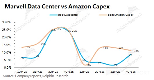 Dolphin Research believes custom ASIC is the drag (company guides 20%+ growth), implying AMZN is not fully satisfied with Marvell’s ASIC. Marvell supplied Trainium 2/Inferentia 3 previously, yet AMZN awarded most Trainium 3 to Alchip, with Marvell focused on Trainium 2.5 (a mid-cycle rev of Trainium 2).