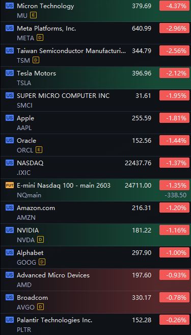 Big Tech Stocks Fell. Micron Down 4%; Meta Down 3%; TSMC, Tesla, Apple And SMCI Down 2%; Nvidia, Oracle, Alphabet And Amazon Down 1%