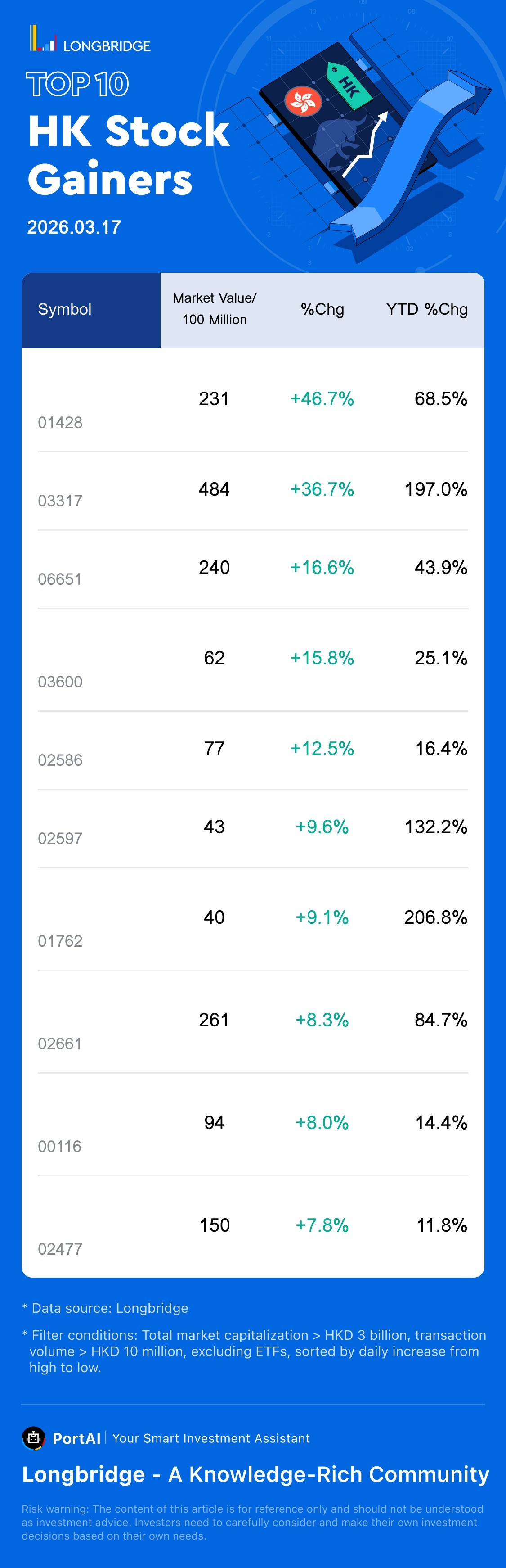 BRIGHT SMART(01428) rose 46.71%, with a trading turnover 8.4 Billion HKD, and a year-to-date rose 68.5%.