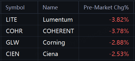 Optical communication stocks dropped in premarket trading. Lumentum and Coherent fell 4%; Corning and Ciena fell 3%.