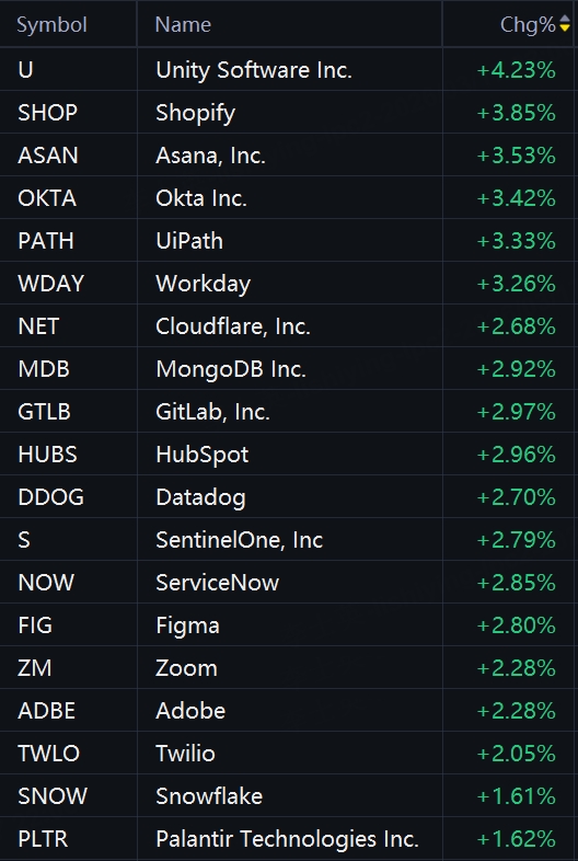 Software stocks rallied in morning trading on Tuesday. Unity, Shopify, and Asana rose 4%; Okta, UiPath, Workday, Cloudflare, ServiceNow, and Figma rose 3%; Zoom, Adobe, Snowflake, and Palantir rose 2%.