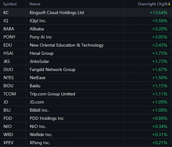 KingSoft Cloud up 14%; iQiyi up 6%; Alibaba, Pony AI up 3%; Bilibili, PDD up 1%.