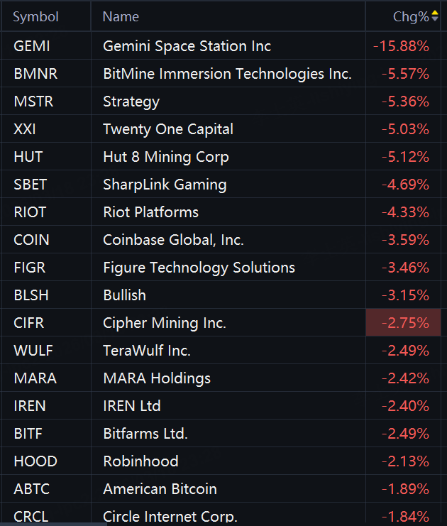 Crypto stocks dropped in morning trading. Gemini Space Station fell 16%; BitMine Immersion Technologies fell 6%; Strategy and SharpLink Gaming fell 5%; Riot Platforms and Coinbase fell 4%; Bullish and Cipher Mining fell 3%; MARA Holdings, IREN, and Robinhood fell 2%.