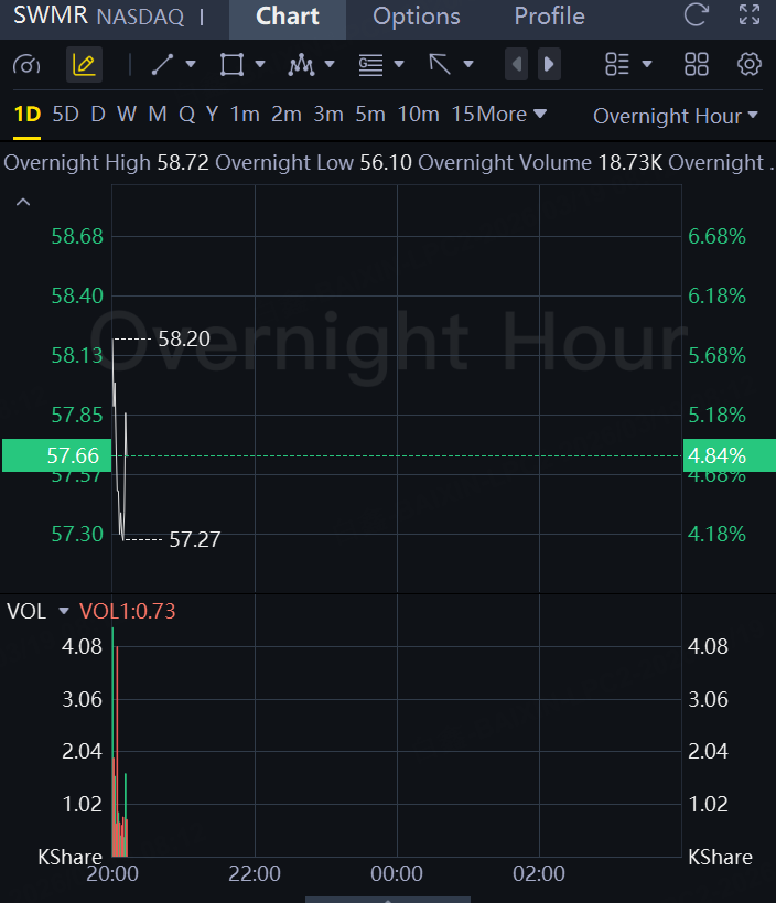 Swarmer rose 5% in overnight trading after surging nearly 1,100% in two days.