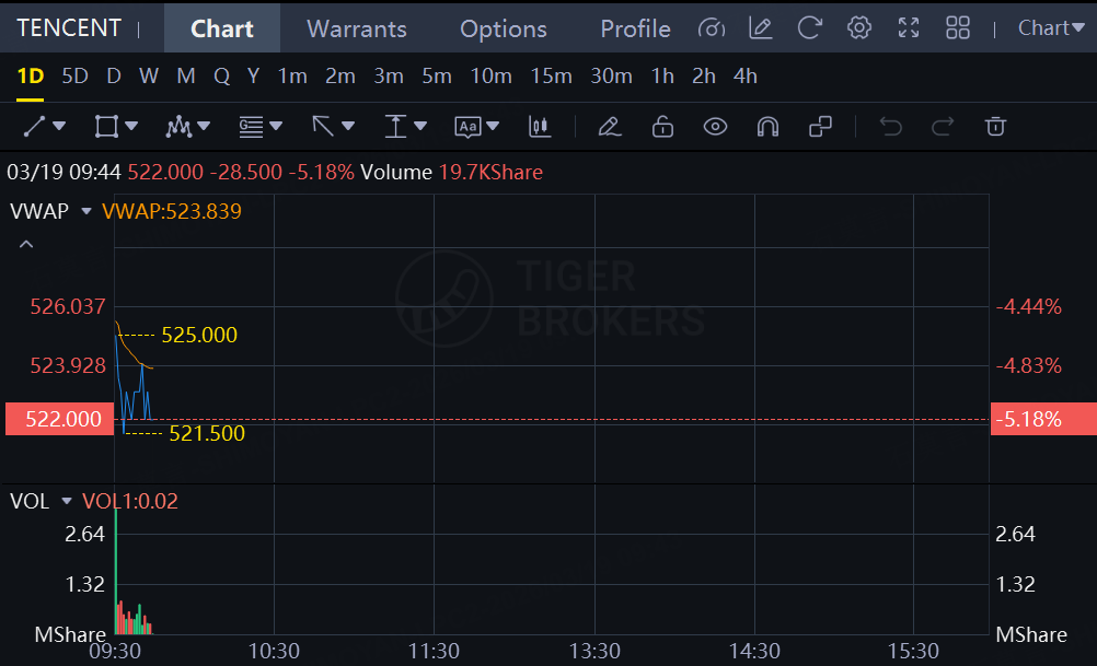 TENCENT stock fell 5.18% in Hong Kong market. TENCENT President Martin Lau stated at the earnings meeting yesterday (18th) that last year's capex missed expectations due to constraints such as GPU supply. If conditions permit this year, the group intends to amplify capex, with investments in AI and models at least doubling.