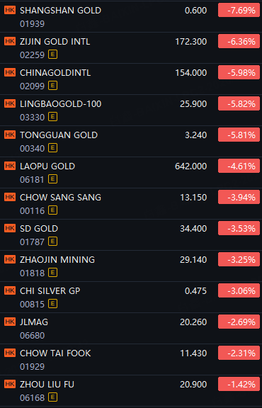 HK Gold Stocks Fell. Shangshan Gold Down 8%; Zijin Gold, China Gold Intl, Lingbao Gold, Tongguan Gold Down 6%; Laopu Gold Down 5%