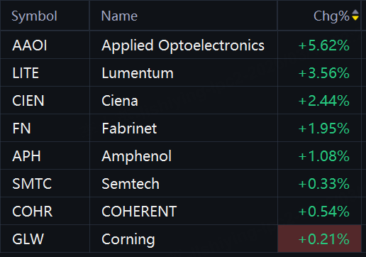Optical communication stocks rose against the broader market trend. Applied Optoelectronics rose 6%; Lumentum rose 4%; Ciena and Fabrinet rose 2%; Amphenol rose 1%.