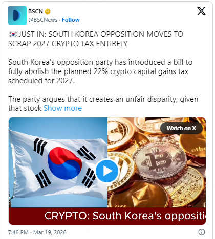 The People Power Party has introduced a bill to strike digital asset taxation from the Income Tax Act completely, ahead of its rescheduled 2027 implementation. The opposition Democratic Party, which holds the legislative majority and previously only agreed to a delay, is now reviewing full abolition.