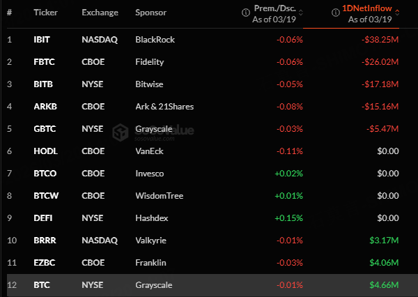 The Bitcoin spot ETF with the highest net outflow on March 19 was iShares Bitcoin Trust, with a net outflow of $38.25 million, according to SoSoValue.