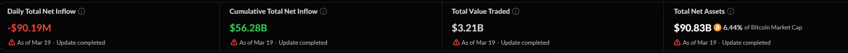 The overall net outflow of the US Bitcoin spot ETF on Thursday was $90.19 million. The total net asset value of Bitcoin spot ETFs is $90.83 billion, and the ETF net asset ratio (market value compared to total Bitcoin market value) is 6.44%.
