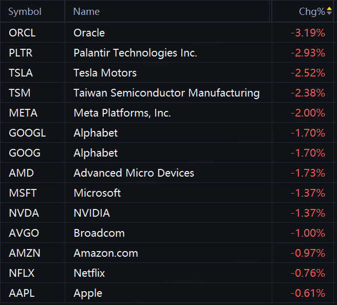 Big tech stocks dropped in morning trading. Oracle, Palantir, and Tesla fell 3%; TSMC, Meta, and Alphabet fell 2%; Microsoft, Nvidia, Broadcom, and Amazon fell 1%.