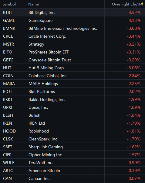 BTBT down 5%; BMNR down 4%; Circle, Strategy, Coinbase down 3%.