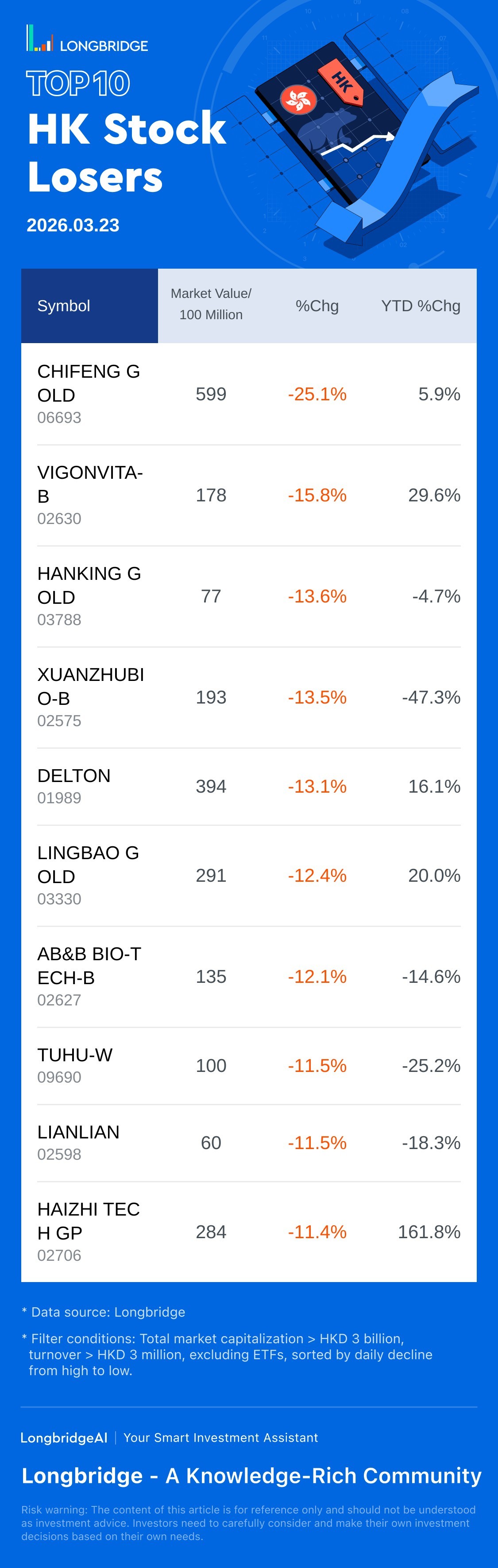 CHIFENG GOLD(06693) fell 25.1%, with a trading turnover 1.4 Billion HKD, and a year-to-date rose 5.9%.