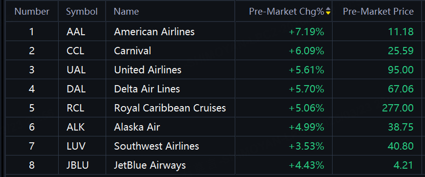 Airline and cruise stocks surged in premarket trading. American Airlines up 7%; Carnival up 6%; United Airlines, Delta Air, Royal Caribbean Cruises up over 5%.