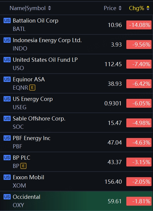 Oil stocks dropped on Monday. Battalion Oil down 14%; Indonesia Energy down over 9%; United States Oil down 7%; Equinor down 6%; Sable Offshore down 5%.