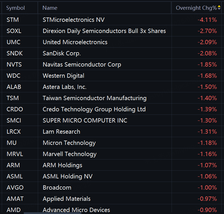 Some chip stocks fell in overnight trading. STMicroelectronics fell 4%; Direxion Daily Semiconductors Bull 3x Shares fell 3%; SanDisk and Western Digital fell 2%; TSMC, Super Micro Computer, Micron Technology, and ASML fell 1%.