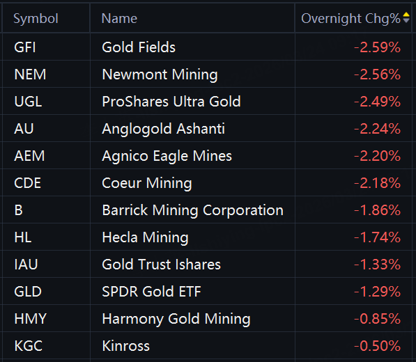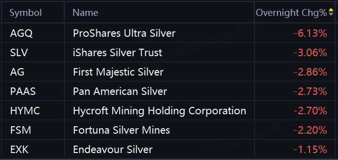 ProShares Ultra Silver fell 6%; iShares Silver Trust, First Majestic Silver, Pan American Silver, Hycroft Mining, Gold Fields, Newmont Mining, and ProShares Ultra Gold fell 3%; Anglogold Ashanti, Fortuna Silver Mines, Agnico Eagle Mines, Coeur Mining, Barrick Mining, and Hecla Mining fell 2%.