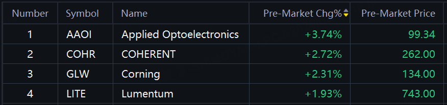 Optical communication stocks rose in premarket trading. Applied Optoelectronics up 3.7%; Coherent up nearly 3%; Corning, Lumentum up around 2%.