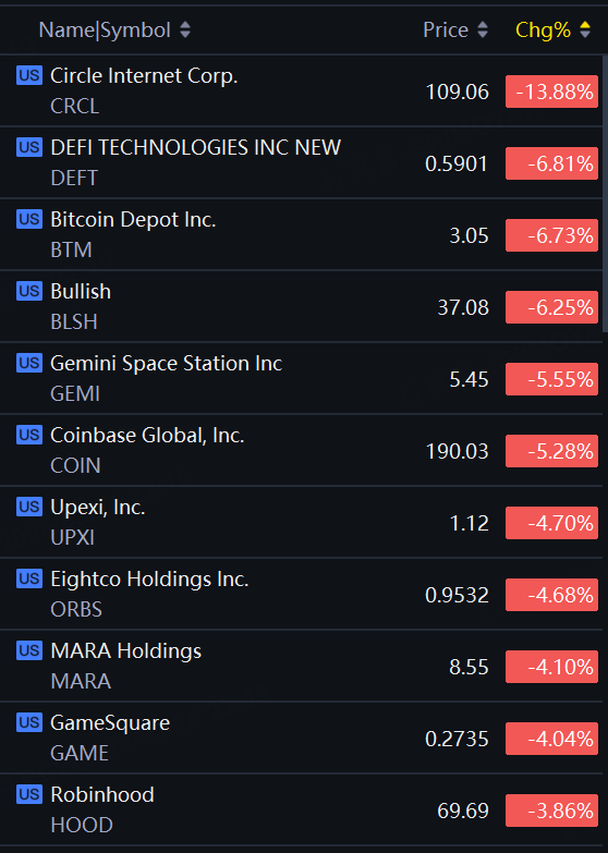 Crypto Shares Fall. Circle Tumbles 14%; Bitcoin Depot Down About 7%; Bullish Down 6%; Gemini Space Station, Coinbase, Upexi Down Around 5%