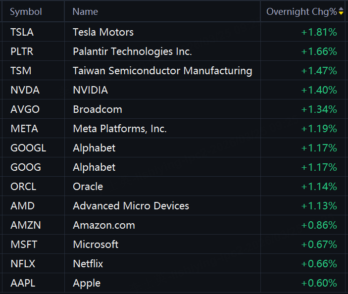 Big tech stocks rose in overnight trading. Tesla, Palantir, and TSMC rose 2%; Nvidia, Broadcom, Meta, Alphabet, Oracle, and AMD rose 1%.