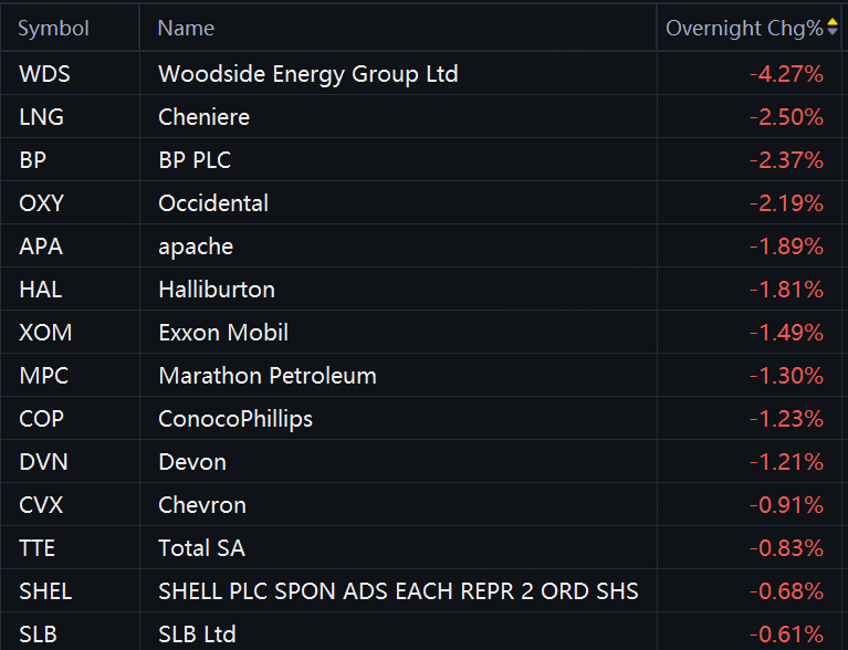 Brent crude futures fell about 6% to $98.30 a barrel. Oil stocks dropped in overnight trading. Woodside Energy fell 4%; Cheniere fell 3%; BP, Occidental, Apache, Halliburton, and Exxon Mobil fell 2%.