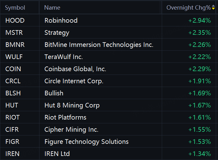 Crypto stocks rallied in overnight trading. Robinhood rose 3%; Strategy, BitMine, TeraWulf, Coinbase, Circle, Bullish, Hut 8, Riot Platforms, and Cipher Mining rose 2%.