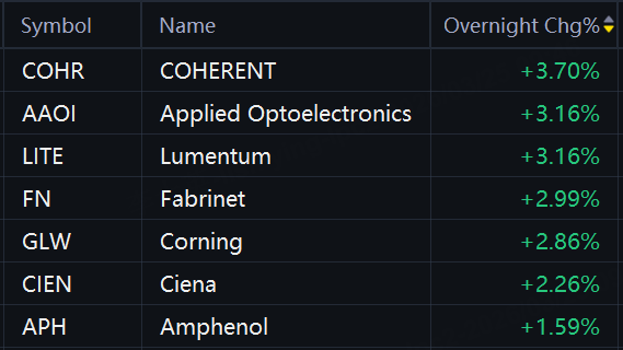 Optical communication stocks rose again in overnight trading. Coherent rose 4%; Applied Optoelectronics, Lumentum, Fabrinet, and Corning rose 3%; Ciena and Amphenol rose 2%.