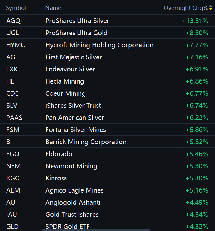 Gold , which investors had been selling to take profit after a long rally, rose 1.6%. Gold, silver stocks and ETFs jumped in overnight trading. ProShares Ultra Silver rose 14%; ProShares Ultra Gold rose 9%; Hycroft Mining rose 8%; First Majestic Silver, Endeavour Silver, Hecla Mining, Coeur Mining, and iShares Silver Trust rose 7%; Pan American Silver, Fortuna Silver Mines, Barrick Mining, and Eldorado rose 6%; Newmont Mining, Kinross, Agnico Eagle Mines, and Anglogold Ashanti rose 5%; Gold Trust Ishares and SPDR Gold ETF rose 4%.