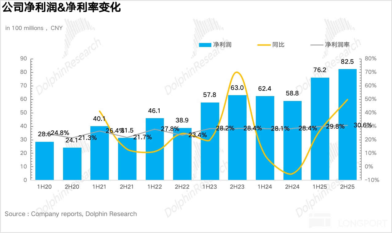 5) Operating leverage unlocked, profit beat. On selling, Nongfu phased out inefficient TV ads, shifting to short videos and live-streaming, and boosted cooler displays to curb wasteful promotions; the S&M ratio fell 250bps to a record-low 17.8%. Admin costs rose on stock-based comp and digitalization outlays, but net margin still reached 30.6%, ahead of consensus.