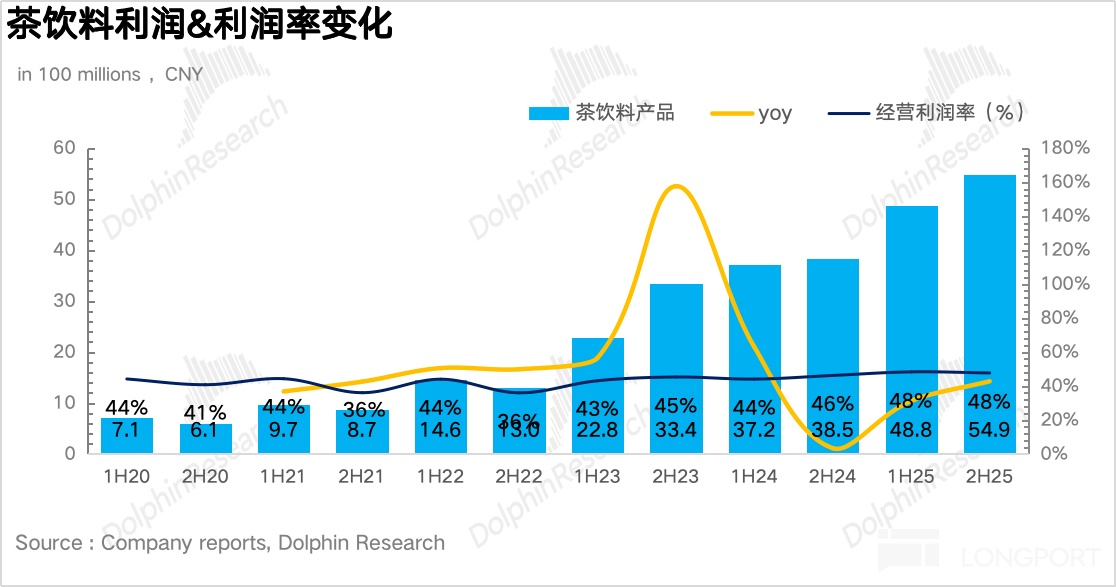 2) Tea becomes the top growth engine: Tea revenue was RMB 11.5bn in H2 2025 (+38.4% YoY), surpassing packaged water to become the largest growth driver. In winter, Nongfu rolled out hot-beverage cabinets nationwide, repositioning Oriental Leaf from a cold drink to a winter hot option and broadening use cases materially. Despite a modest give-back from the 'RMB1 Enjoy' promotion that nudged OPM down QoQ to 47.7%, tea remains Nongfu’s most profitable segment.