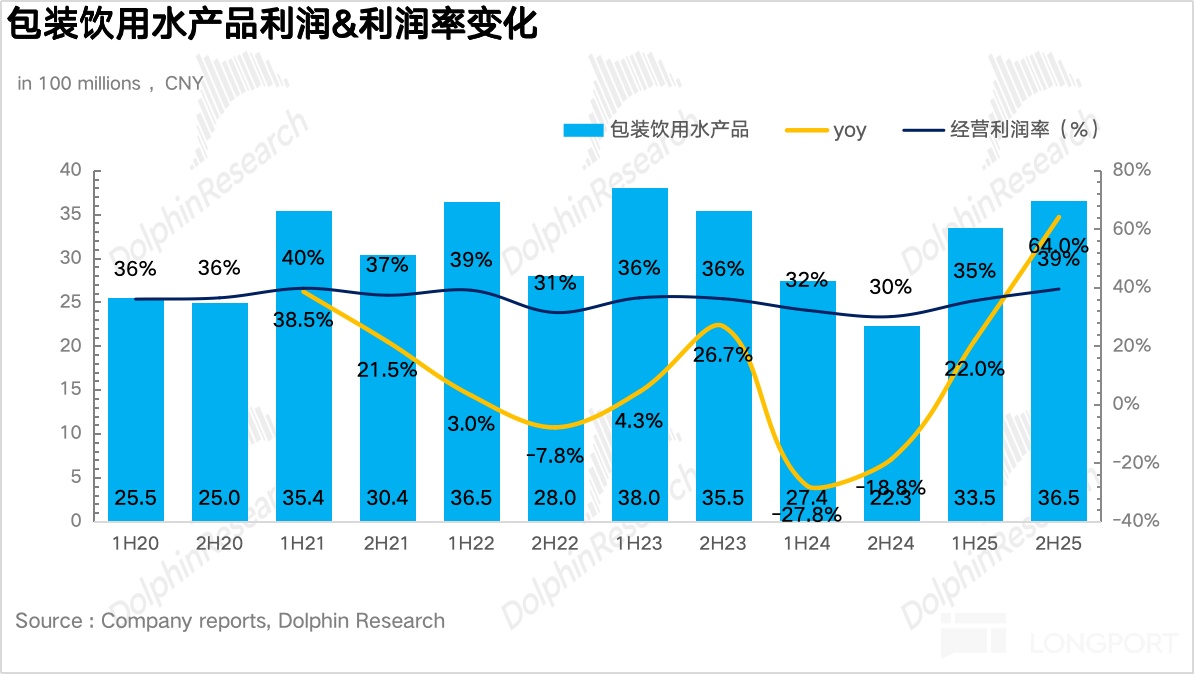 In 2025, Nongfu also stepped up promotion of larger red-cap packs (1.5L, 2L, 4L). As these ship mainly to households and F&B channels, replacing tap water for cooking and tea, consumers prioritize water source quality—a strong fit with red-cap’s positioning. With red-cap mix up, packaged water OPM climbed to 39.4%, a new high.