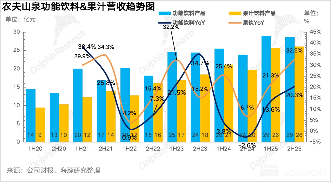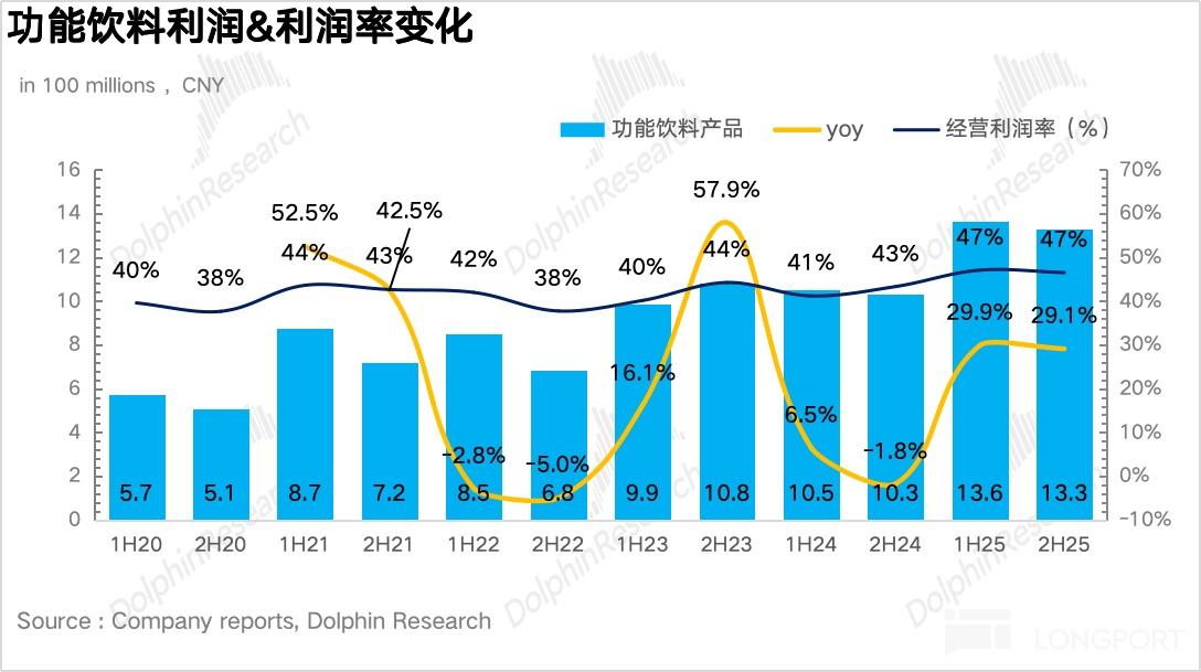 Although these segments lack first-mover advantages and get fewer resources than water & tea, both delivered strong H2 results. Functional drinks (Scream, 'Liangli Di', etc.) posted RMB 2.86bn revenue in H2 (+20% YoY), with a sequential pickup. Growth was driven by faster rollout of electrolyte water ('Liangli Di') and a comprehensive upgrade of the Scream product matrix.