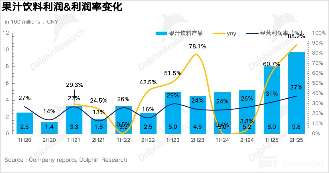 Juice revenue reached RMB 2.61bn (+33% YoY). The 17.5° NFC orange juice stood out: riding the health trend and a late-2024 tie-up with Sam’s Club, NFC orange became a hit, expanding household consumption. More notably, with premiumization, juice OPM jumped 1,000bps in H2 to 37.3%.