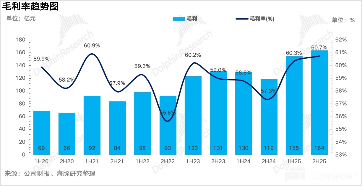 4) GPM kept improving. Key inputs and packaging (PET, corrugated) stayed at low levels in H2, while red-cap water and other high-GPM categories (electrolyte water, NFC juice, 'Liangli Di') ramped. As a result, GPM expanded 340bps to 60.7% in H2.
