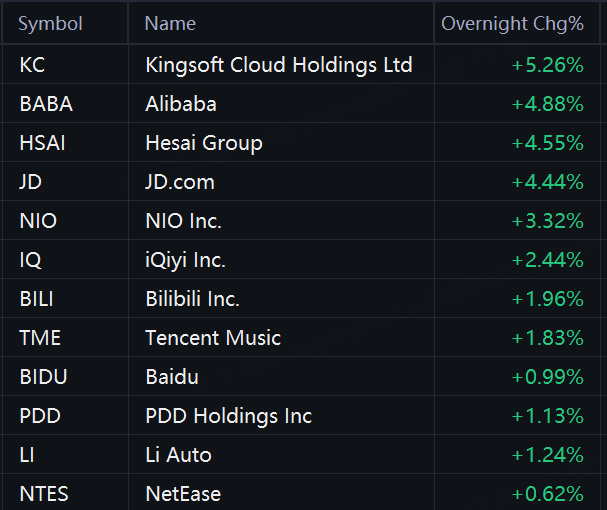 Chinese ADRs jumped in overnight trading. Kingsoft Cloud, Alibaba, and Hesai Group rose 5%; JD.com rose 4%; NIO rose 3%; iQiyi, Bilibili, and Tencent Music rose 2%; PDD Holdings, Li Auto, and Baidu rose 1%.