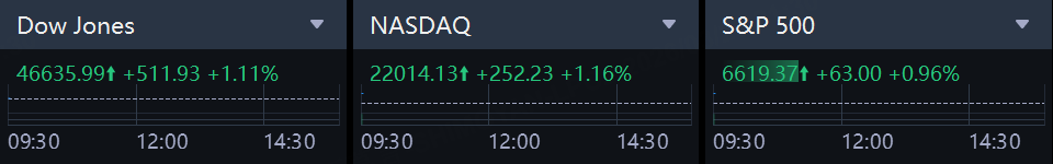 Dow Jones Industrial Average gained 512 points, or 1.11%. S&P 500 and Nasdaq 100 advanced 0.96% and 1.16%, respectively.