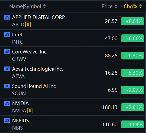 Nvidia-linked shares jumped on Wednesday. Nvidia up 2.8%; Applied Digital, Intel, CoreWeave up over 6%; Aeva Tech up 5%; SoundHound AI up 3%.