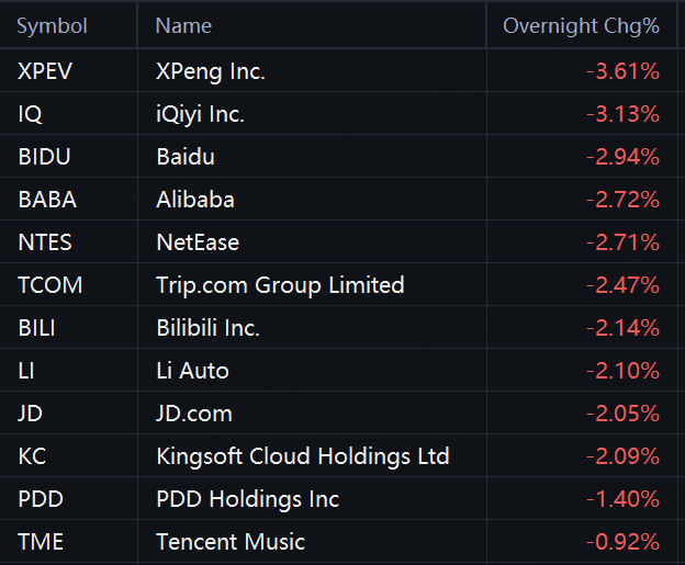 Chinese ADRs dropped in overnight trading. XPeng fell 4%; iQiyi, Baidu, Alibaba, NetEase, and Trip.com fell 3%; Bilibili, Li Auto, Kingsoft Cloud, and JD.com fell 2%; PDD Holdings fell 1%.
